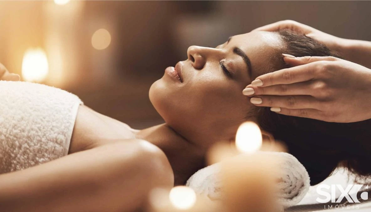 Ambientes de spa com salas de massagem e atendimento individual, Sauna seca e úmida, Áreas de descanso exclusivas, Spa completo para revitalização do corpo e da mente.