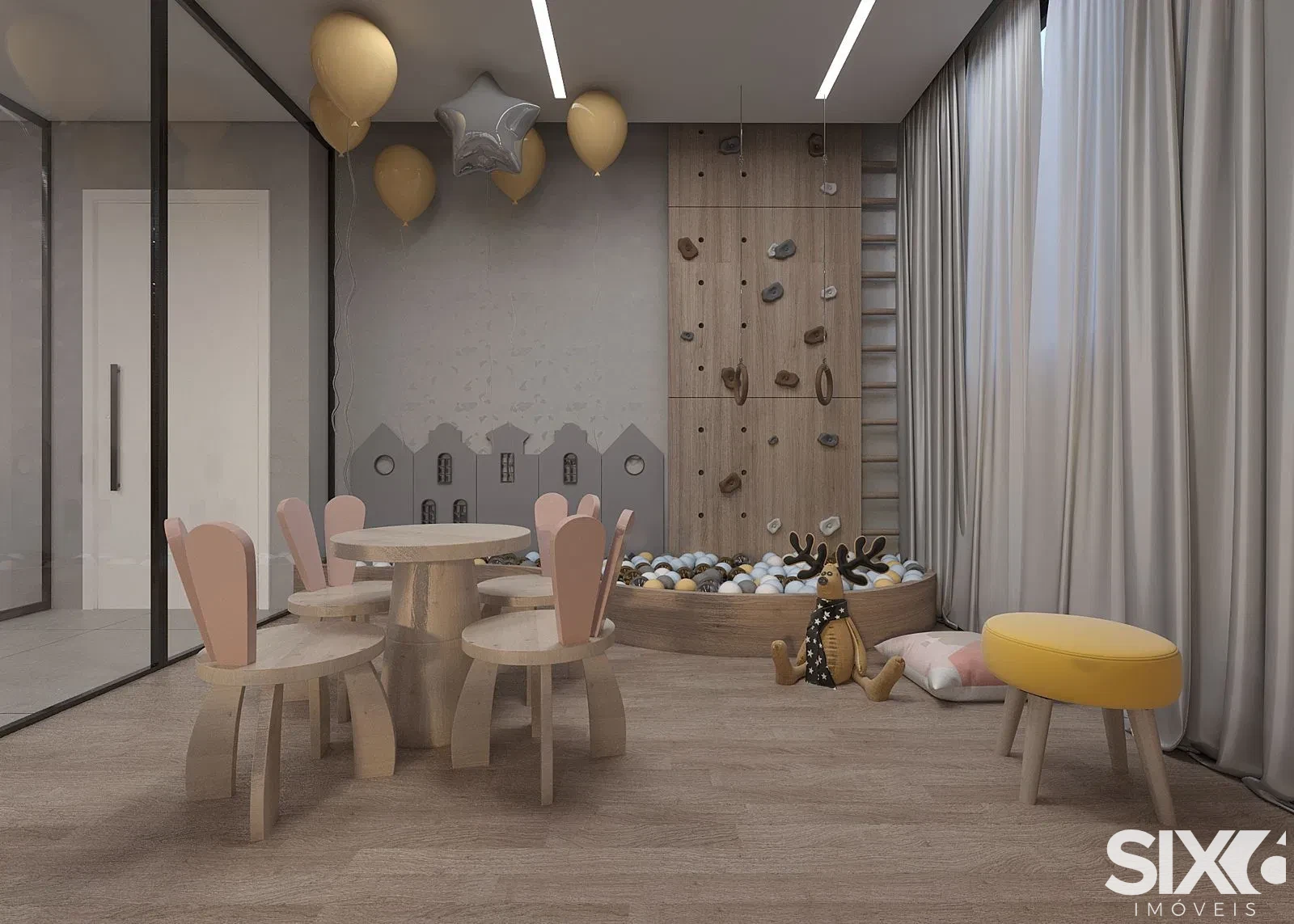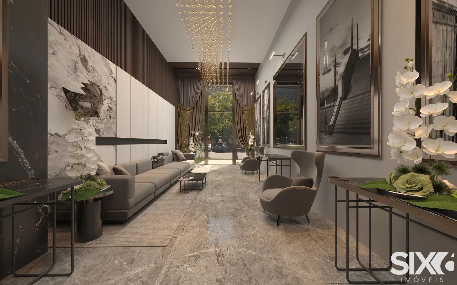 Academia completa, sistema de alarme e circuito interno de TV, bicicletário, brinquedoteca e playground, hall de entrada mobiliado, lounge e espaço gourmet, piscina adulta, salão de festas elegante,
