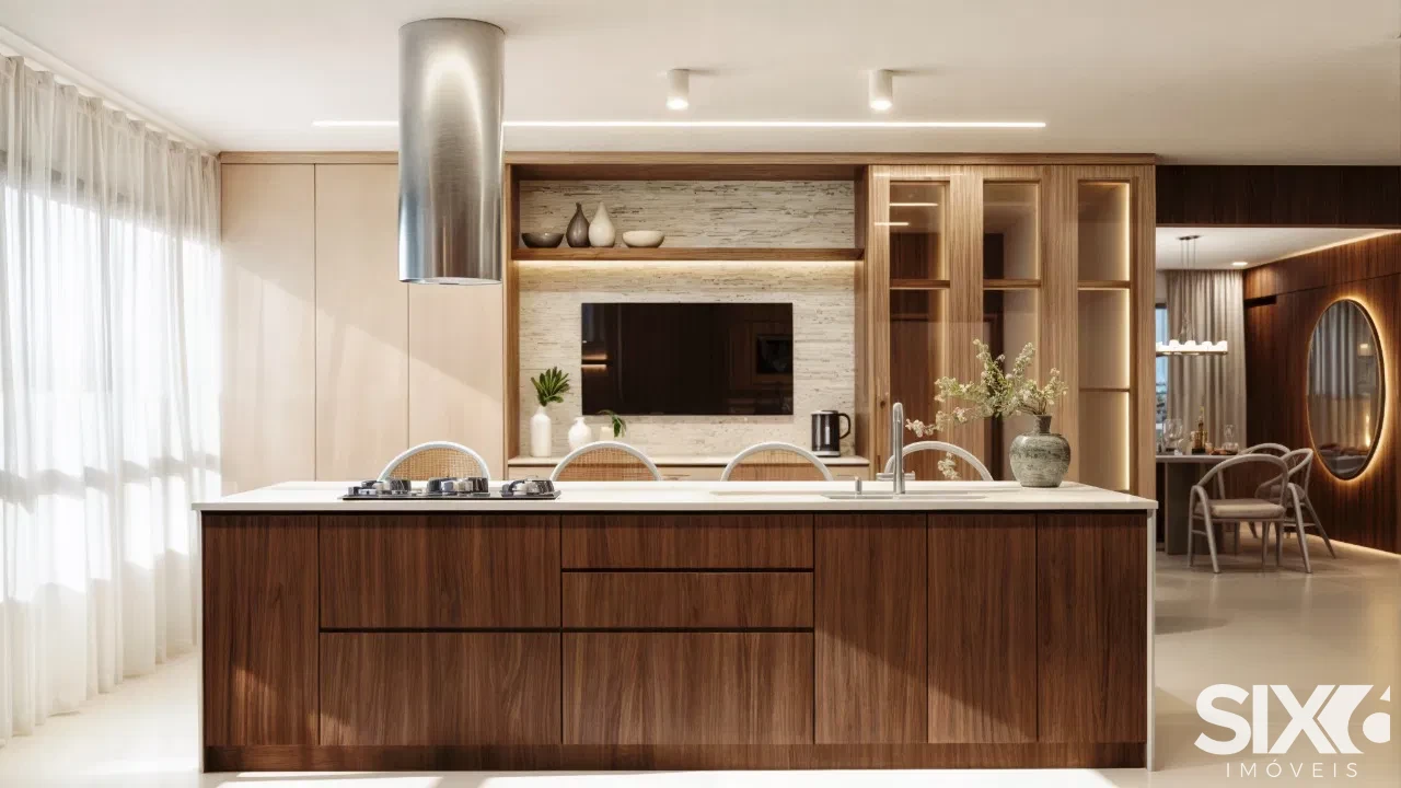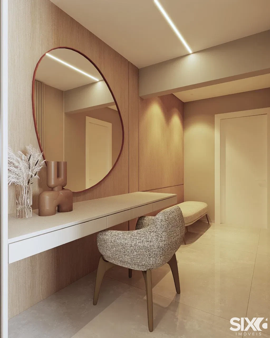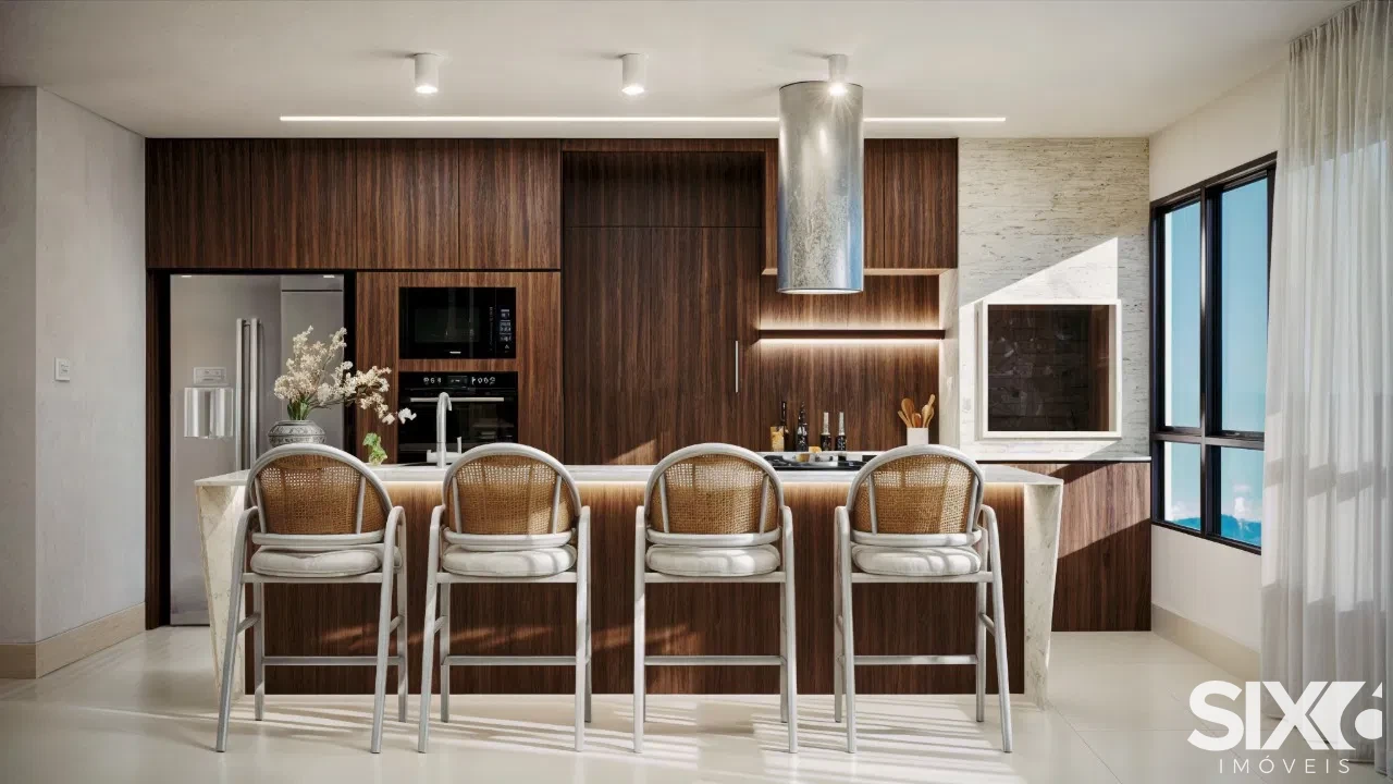 4 suítes espaçosas, banheiro social e lavabo, living integrado, varanda gourmet, sacada com vista panorâmica, revestimento em porcelanato, 3 vagas de garagem.
