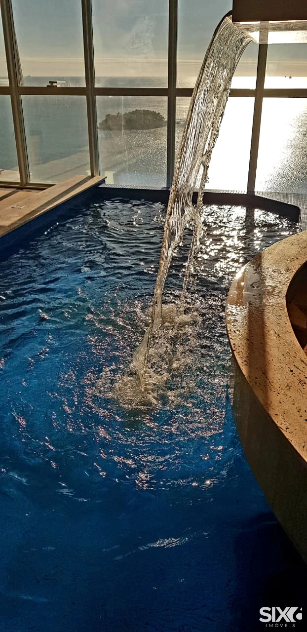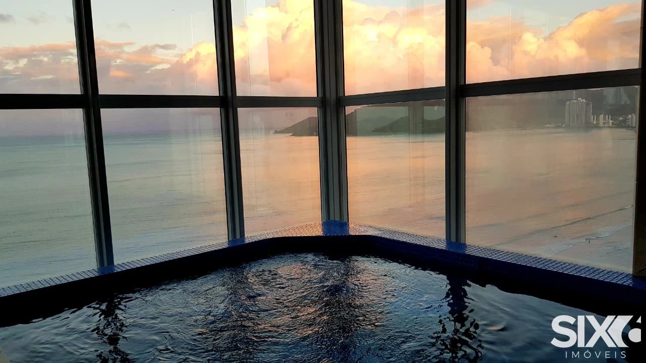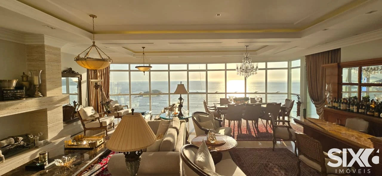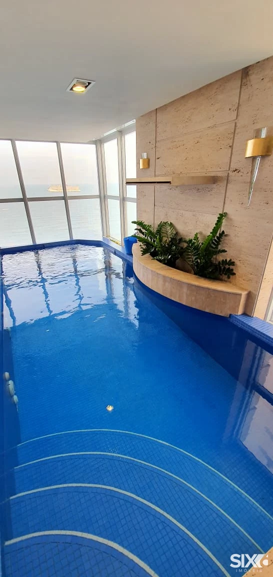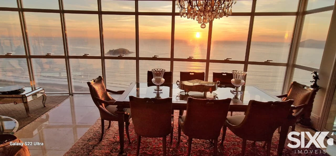 Mobiliado e decorado, 4 Suítes com hidromassagem (suíte principal com closet, sala de banho e vista para o mar), ampla sala de jantar e estar, com ponto de lareira a gás e vista panorâmica para o mar, dependência de empregada, 4 vagas de garagem, piscina panorâmica com vista para o mar espaço gourmet grill e ponto com churrasqueira à gás, 316 m² de área privativa.