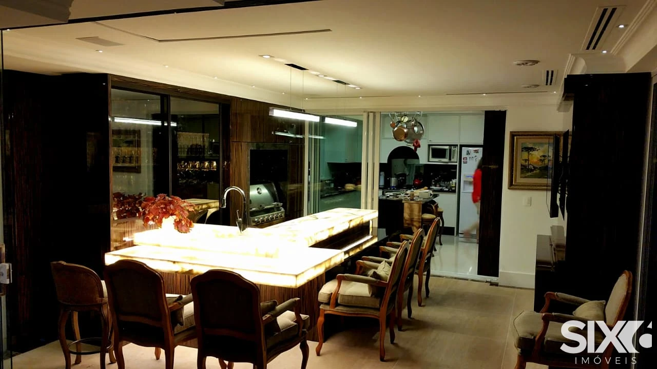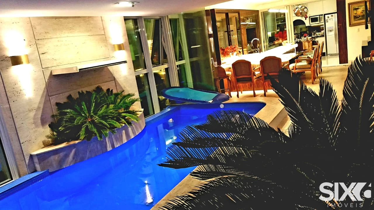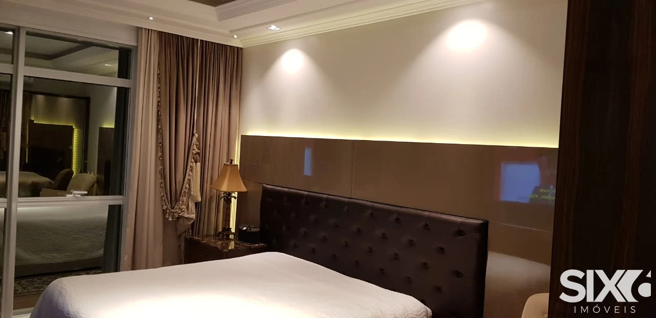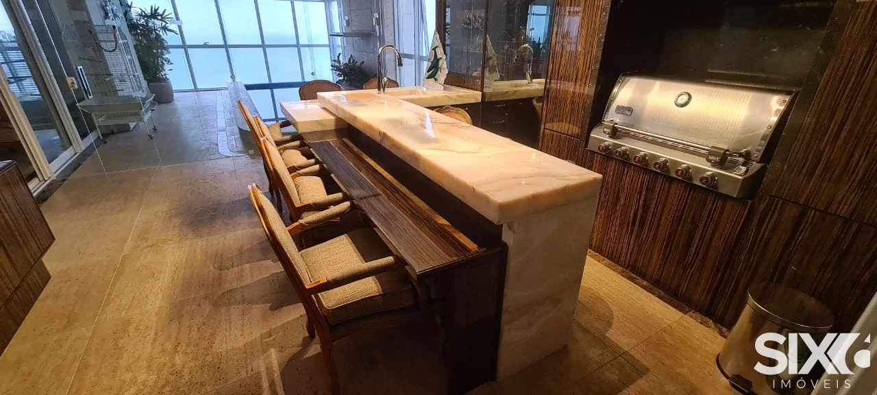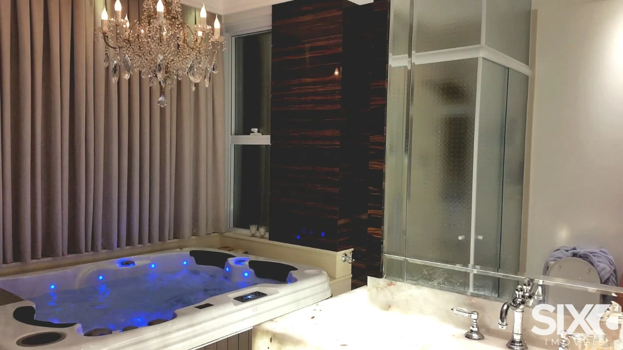 Mobiliado e decorado, 4 Suítes com hidromassagem (suíte principal com closet, sala de banho e vista para o mar), ampla sala de jantar e estar, com ponto de lareira a gás e vista panorâmica para o mar, dependência de empregada, 4 vagas de garagem, piscina panorâmica com vista para o mar espaço gourmet grill e ponto com churrasqueira à gás, 316 m² de área privativa.