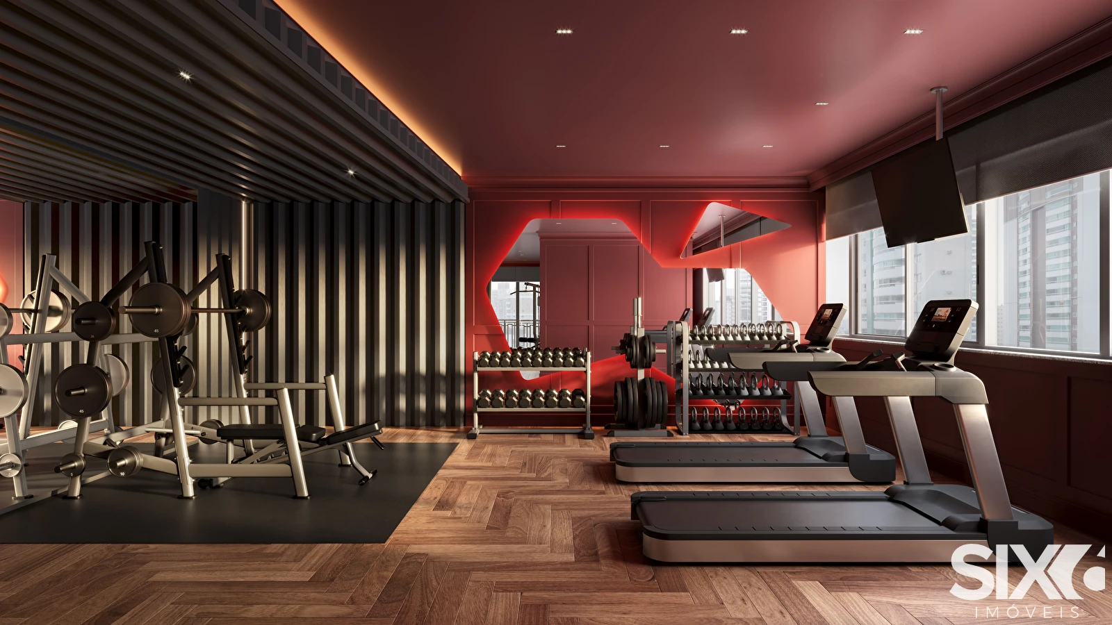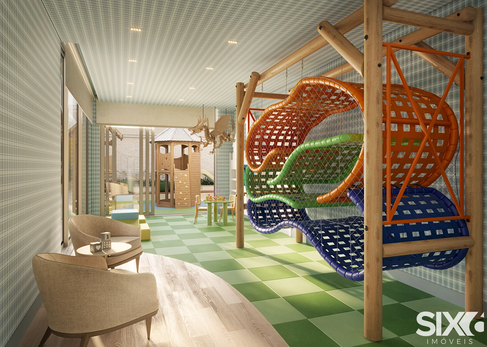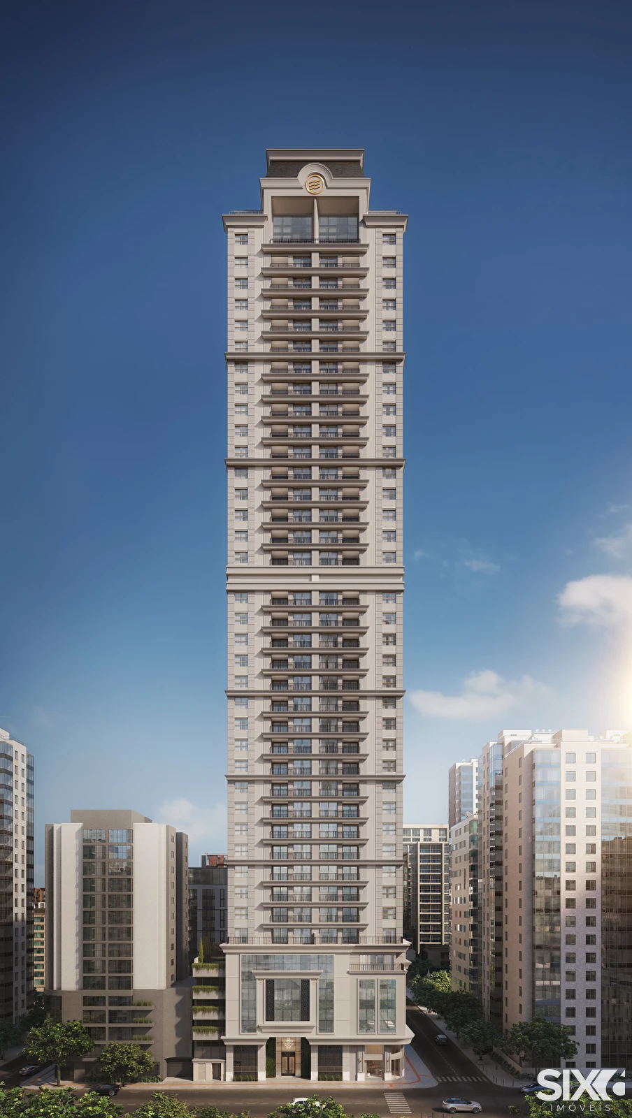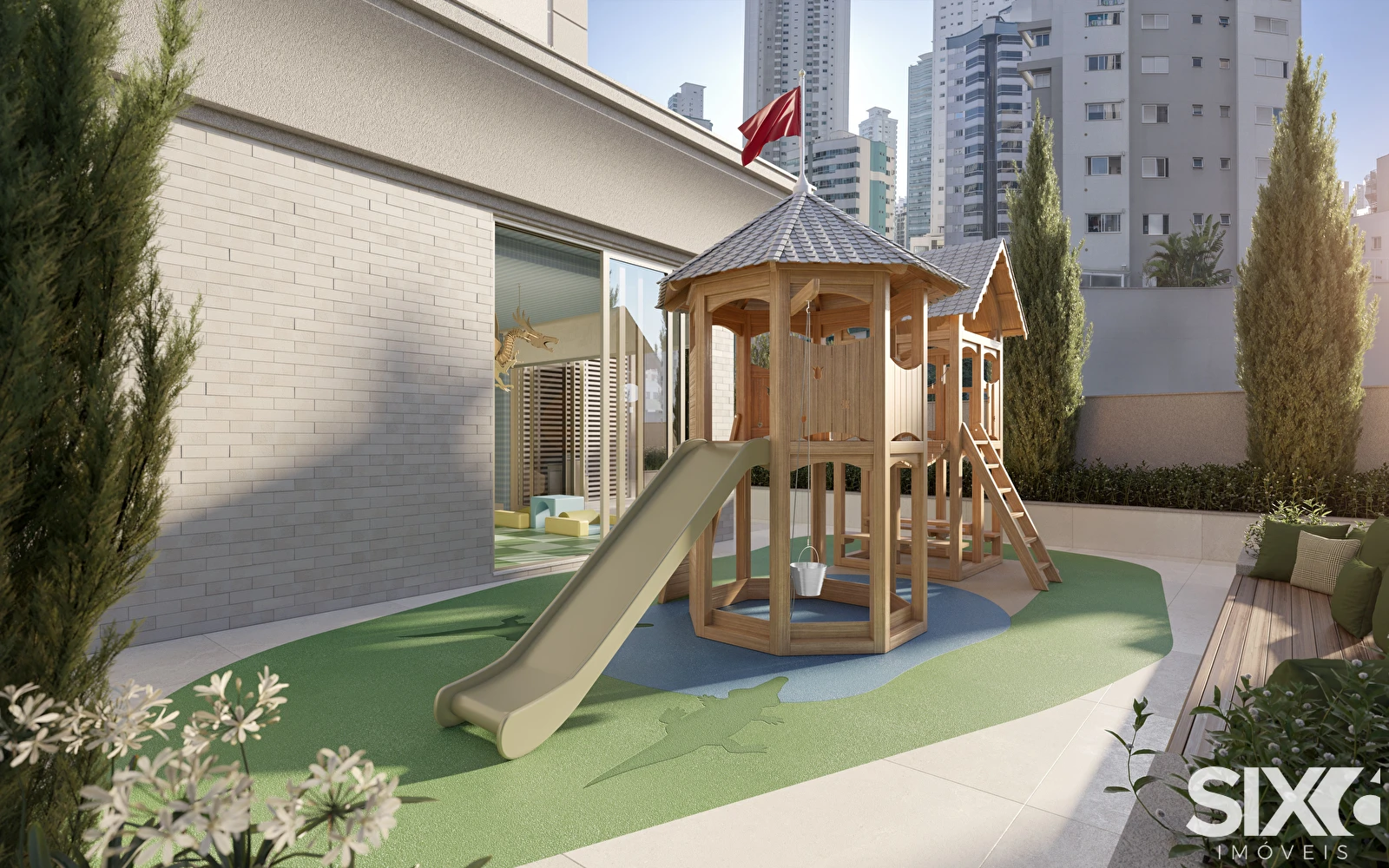 Hall social com pé direito duplo, box de praia, bicicletário, salas comerciais, lazer, espaço fitness, espaço teen, salão de festas, lounge externo, brinquedoteca, área de fraldário, lavabo, sala de massagem, sauna seca e úmida, SPA, piscina adulto e infantil, gourmet 1, gourmet 2, quadra poliesportiva.