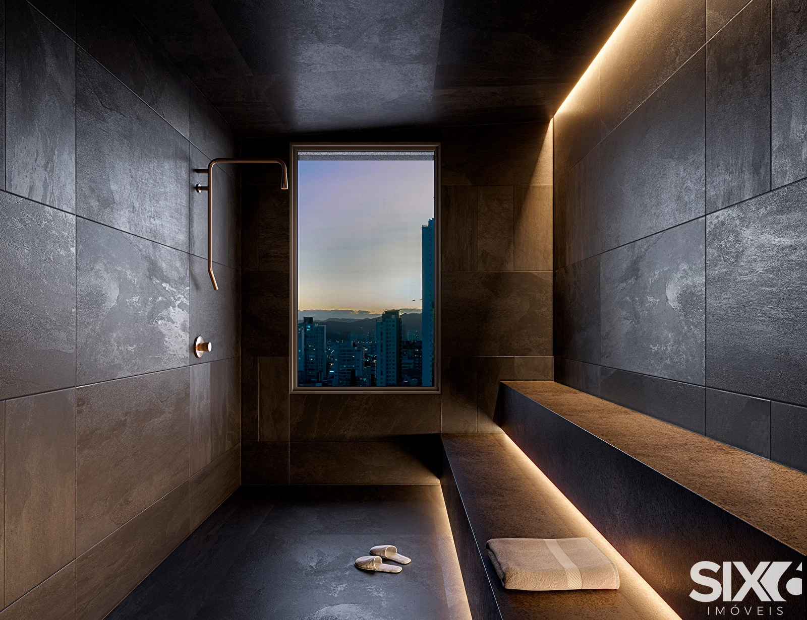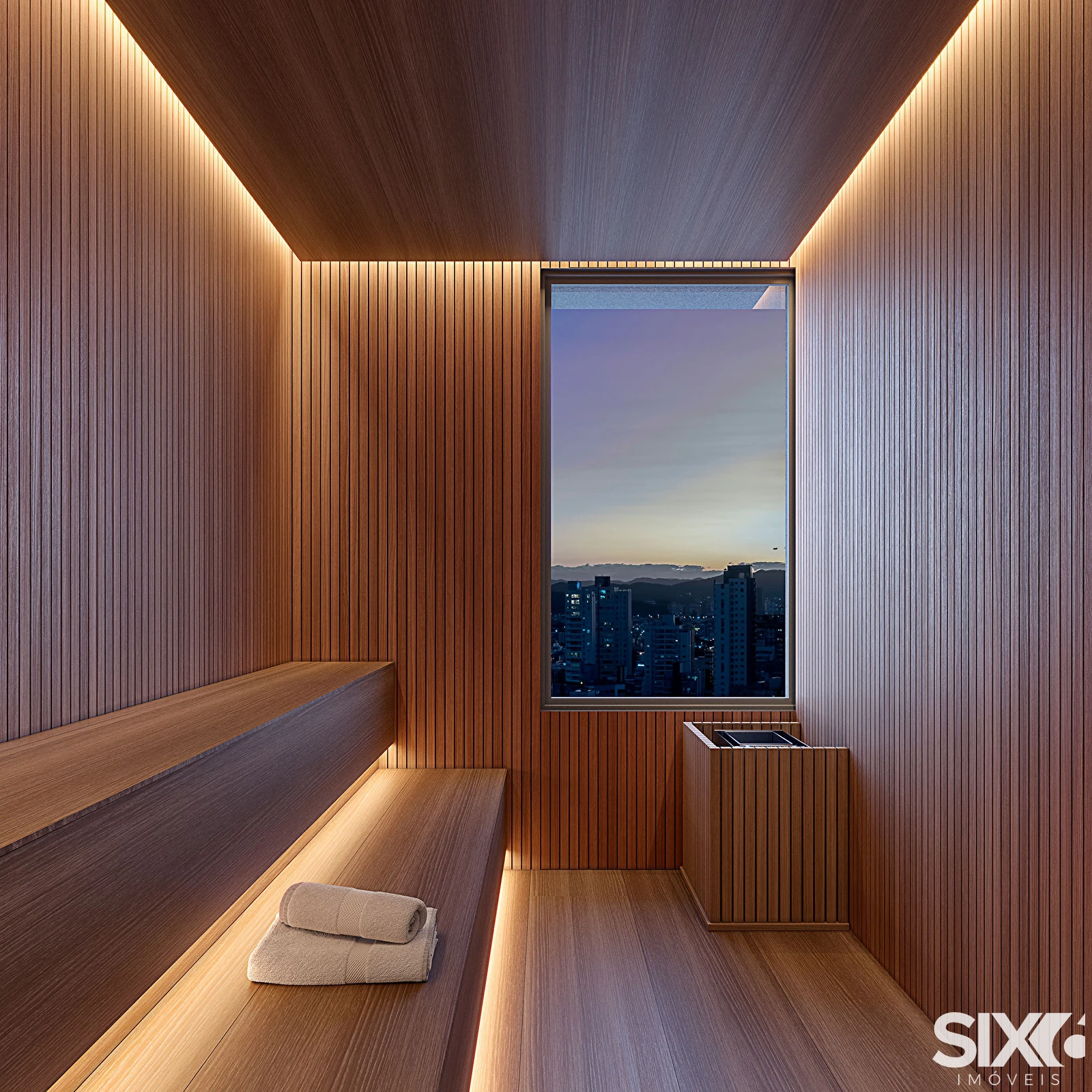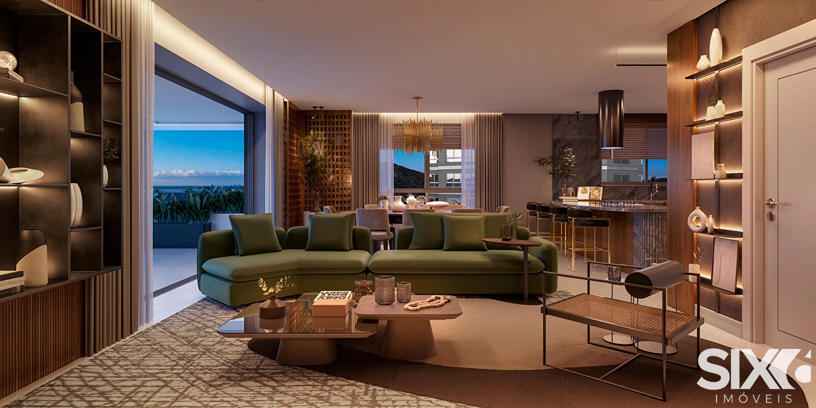 4 suítes, sendo 1 master com closet e banheira de imersão; 5 vagas de garagem; varanda com churrasqueira a carvão; piso vinílico na área íntima, infraestrutura para adega climatizada; suítes com persianas motorizadas integradas com tecnologia Embraed; infraestrutura para 2 cubas, 2 sanitários e 2 chuveiros; box de praia, pé direito de aproximadamente 2,65m no living; 1 adega.