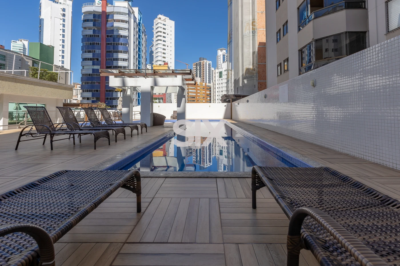 Piscina adulto e infantil, salão de festas, cinema, deck, solarium, quiosque com churrasqueira, sauna seca e úmida, playground, academia, Portaria 24 horas.