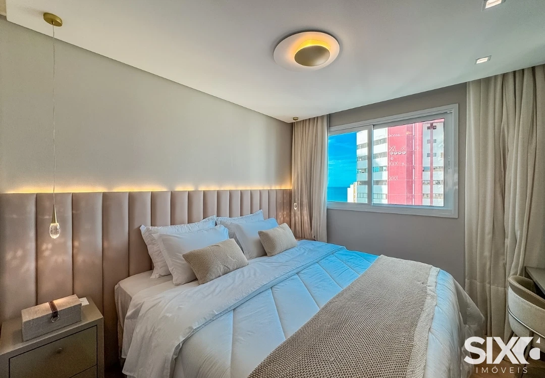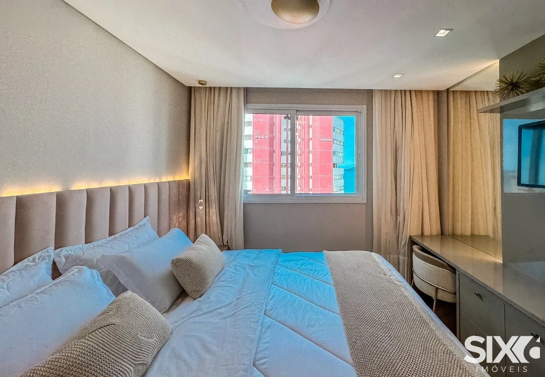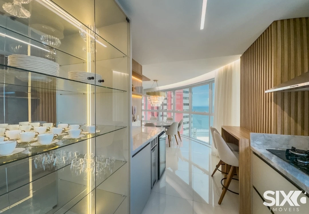 Apartamento com vista para o mar, com 132m² de área privativa, distribuídos em 02 suítes, 02 dormitórios, sala de estar e jantar, área de serviço, lavabo social, andar alto, mobiliado e decorado, cozinha, churrasqueira a carvão e 02 vagas de garagem.