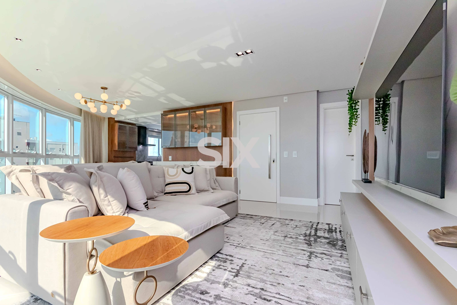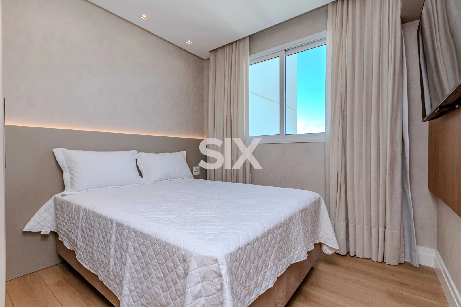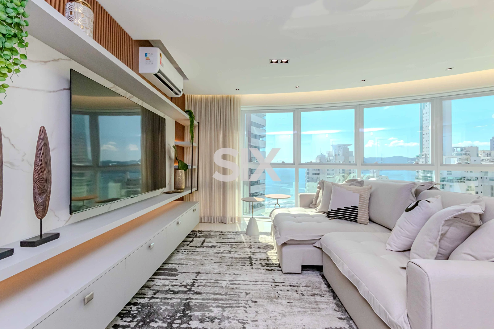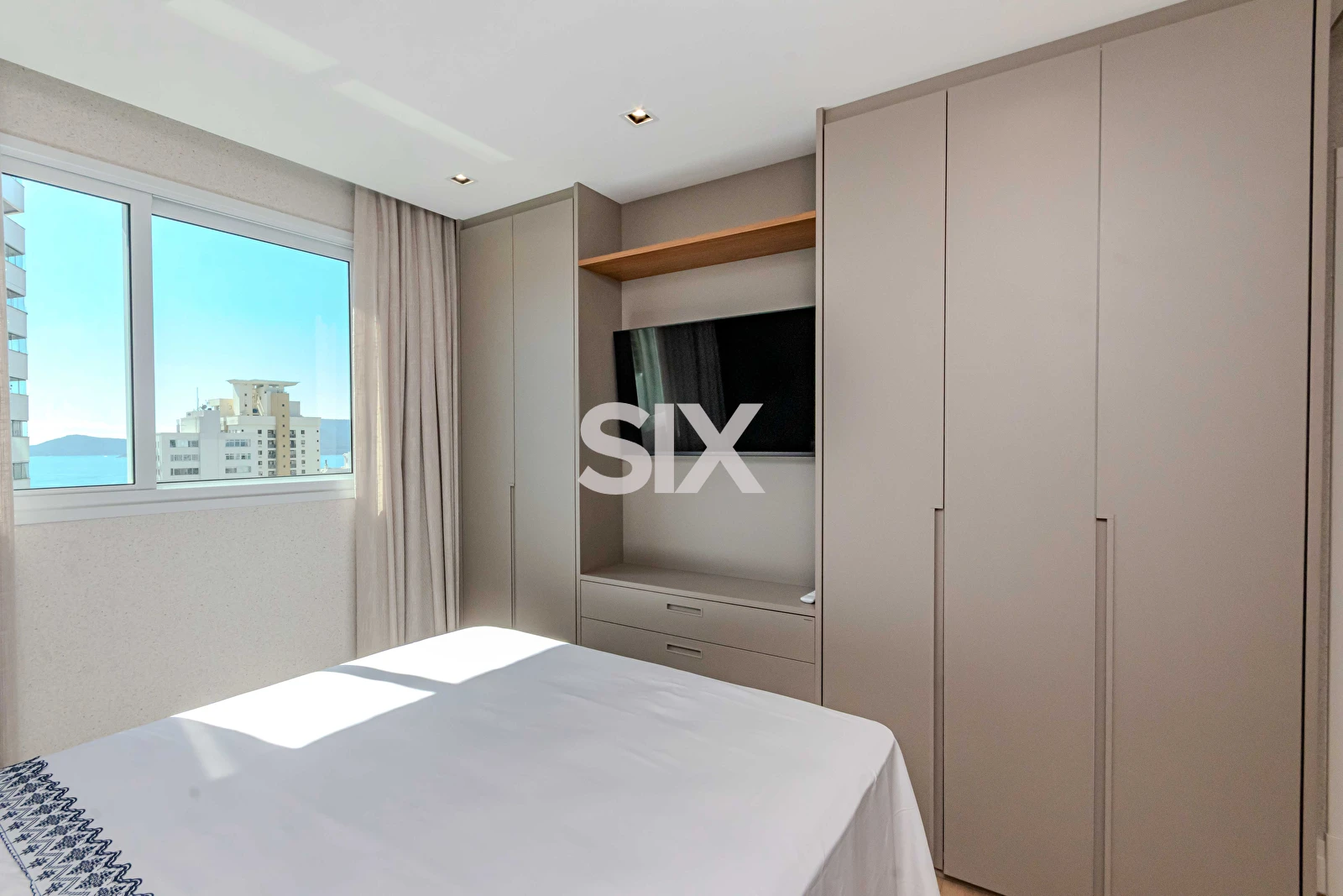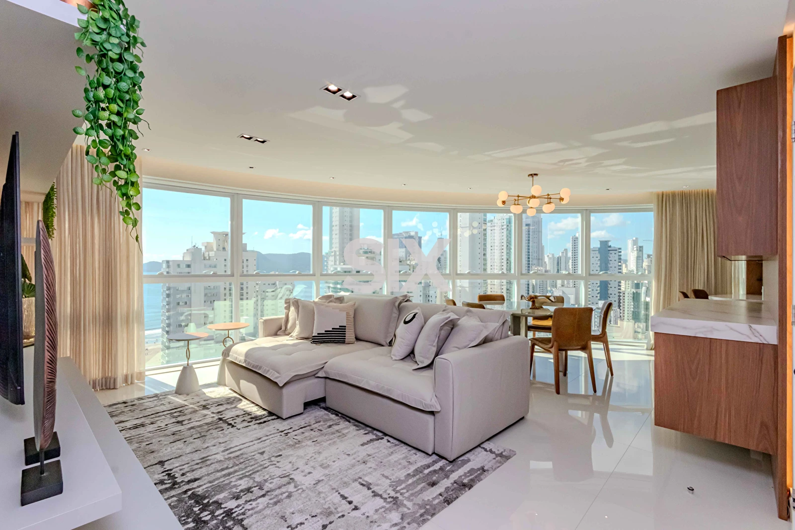 Apartamento de 131,70m² privativos, totalmente mobiliado e equipado, com living integrado com sala de jantar e cozinha, 04 dormitórios, sendo 02 suítes + 02 quartos, lavabo, vista parcial para o mar, 03 vagas de garagem livres, área de serviço.