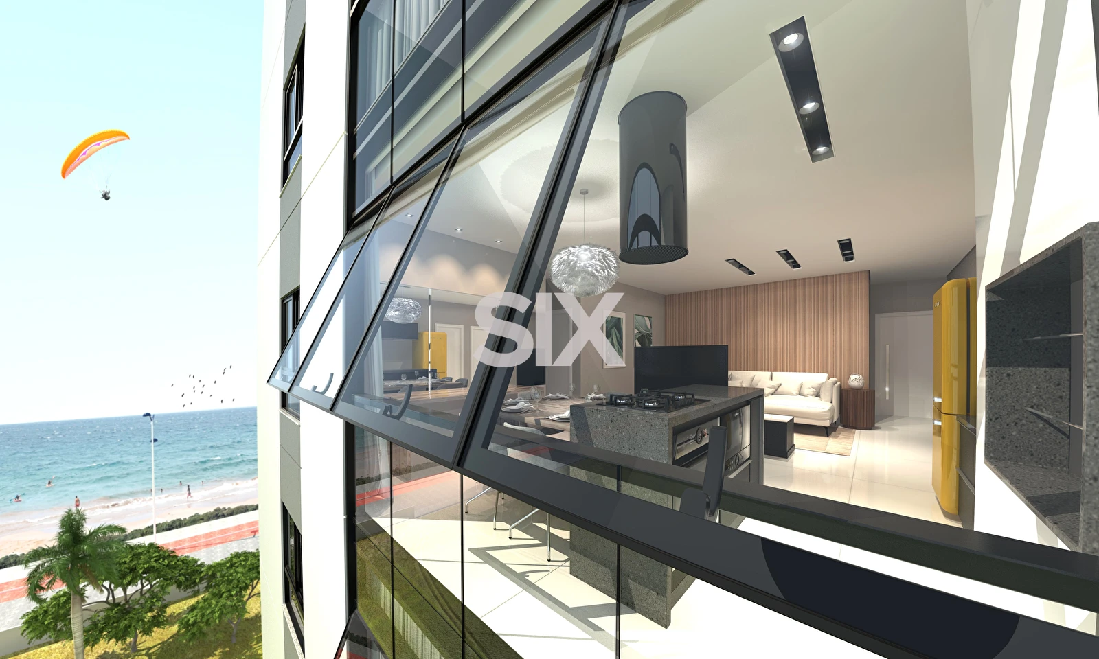 São 04 suítes, living para 02 ambientes (estar e jantar), sacada integrada com churrasqueira, vista para o mar, 370 m² área privativa, 05 vagas de garagem.