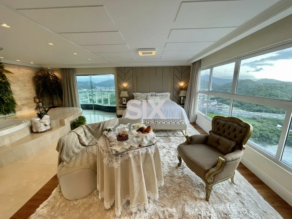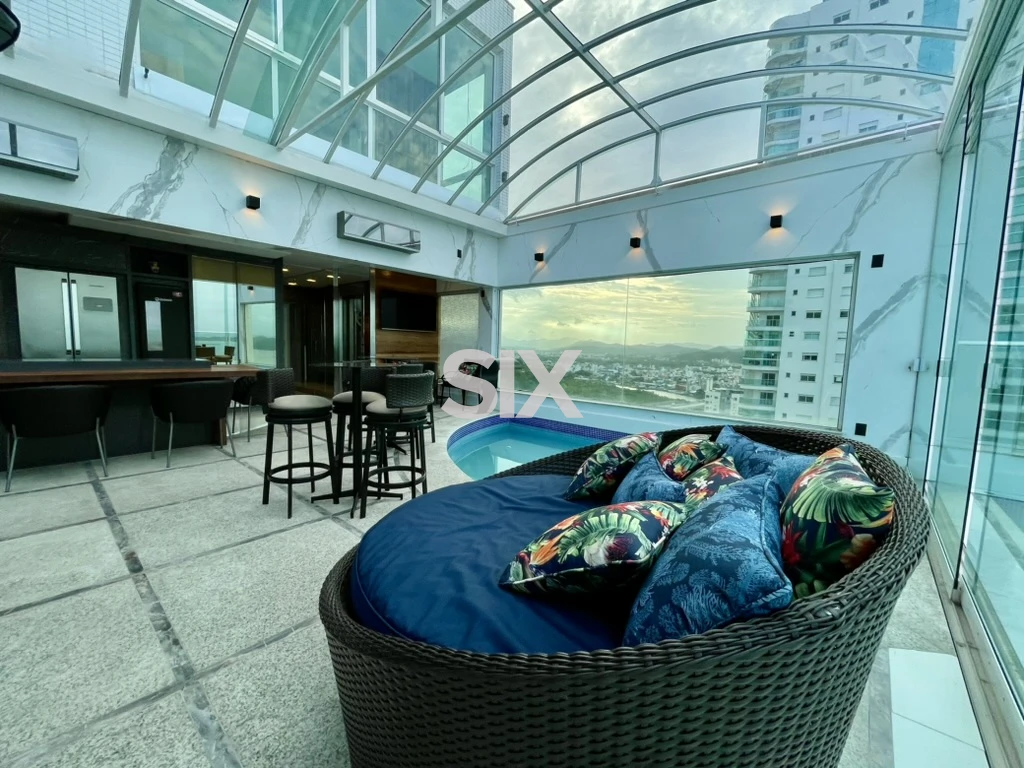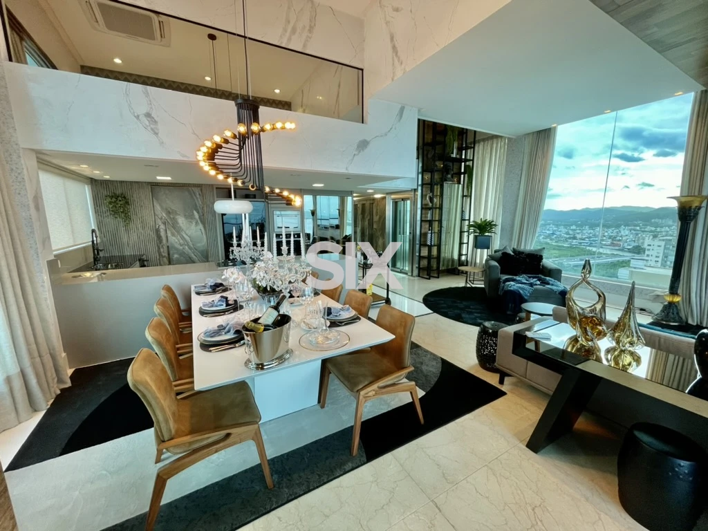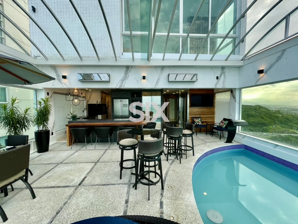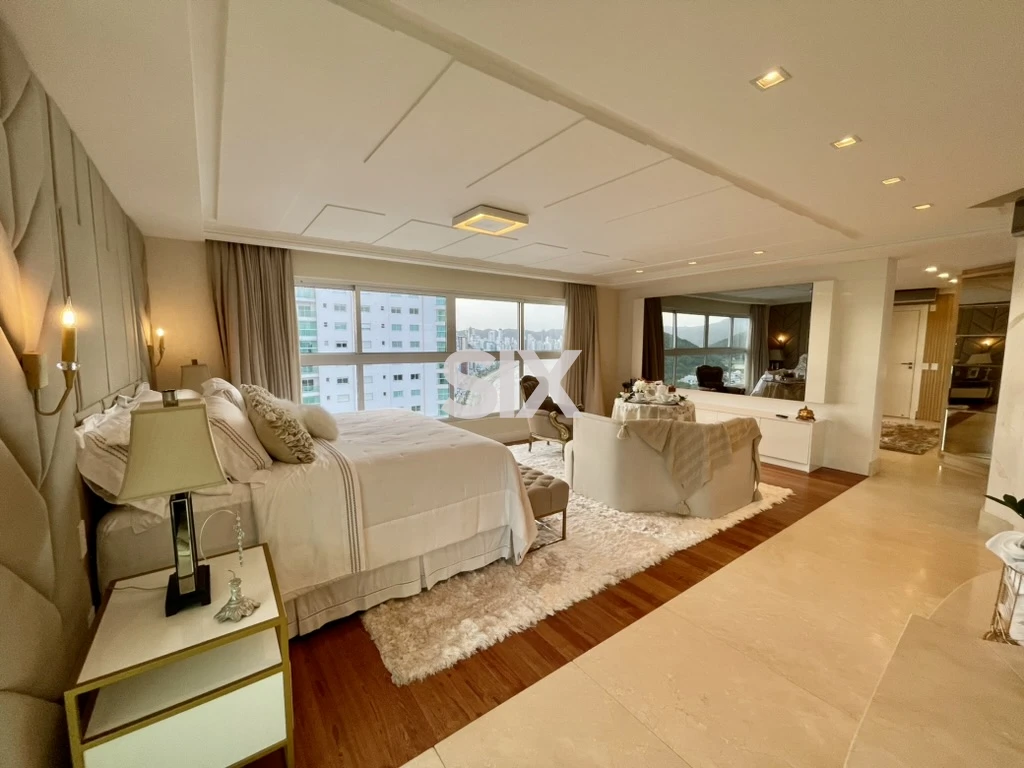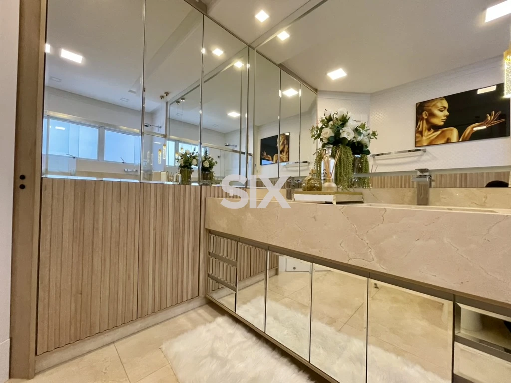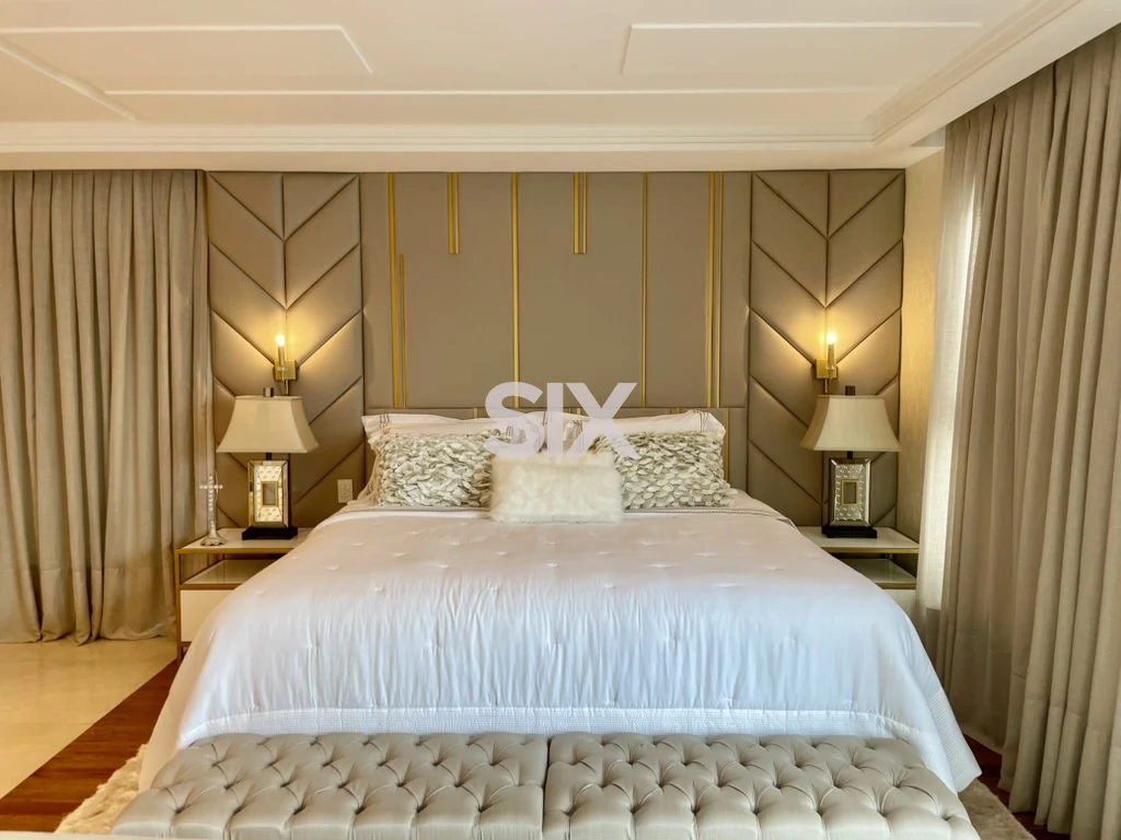 Suíte Master de 90 m² com Hidro com Cromoterapia e Sacada, área de festa com cozinha completa e churrasqueira (com paredes laterais de vidro duplos laminado e temperado), piscina embutida no chão com aquecimento solar e trocador de calor (com teto retrátil com proteção UV), varanda.
