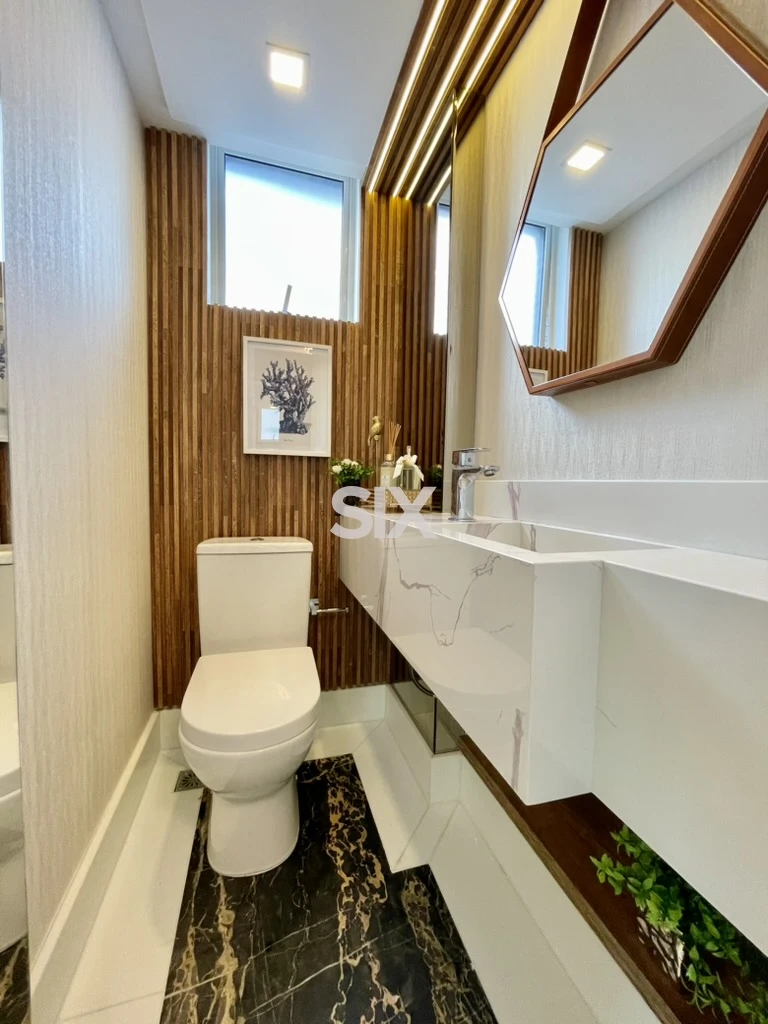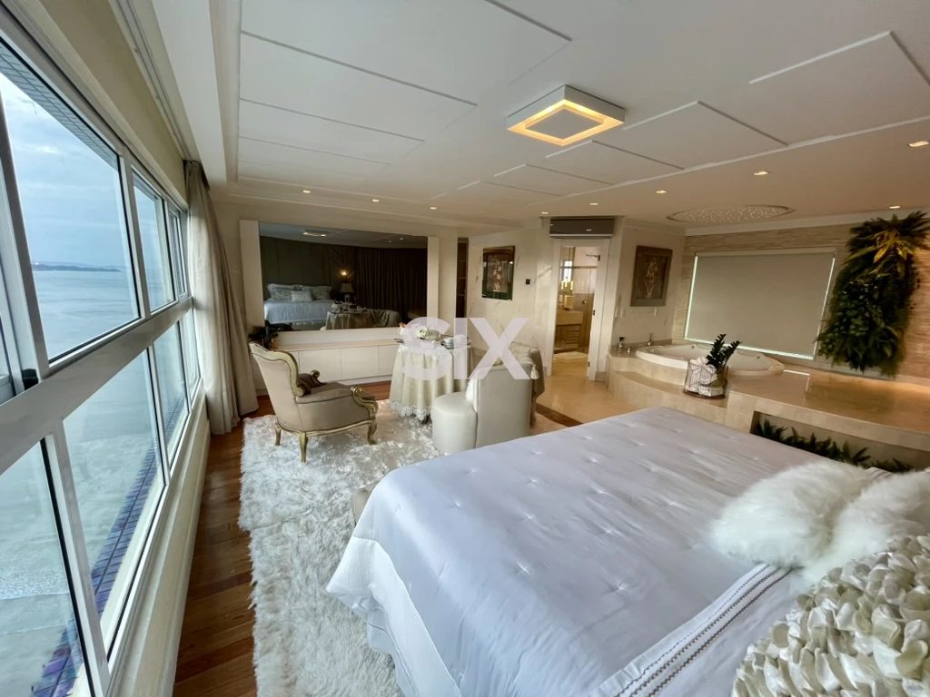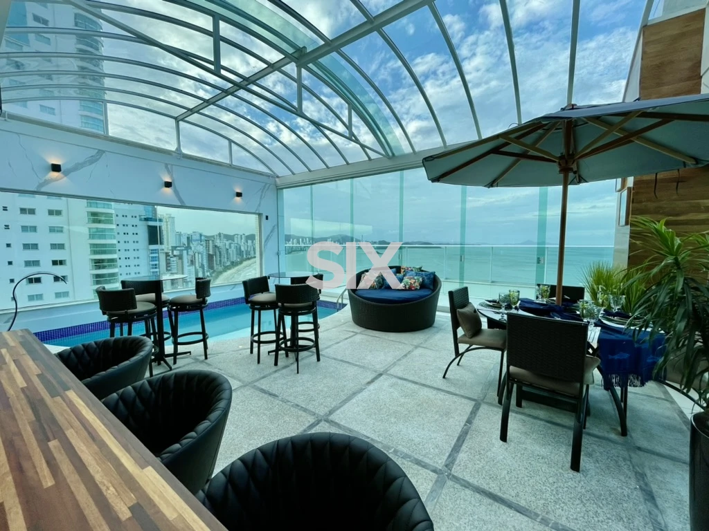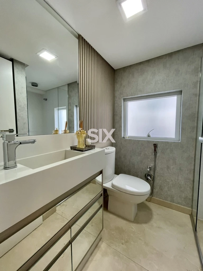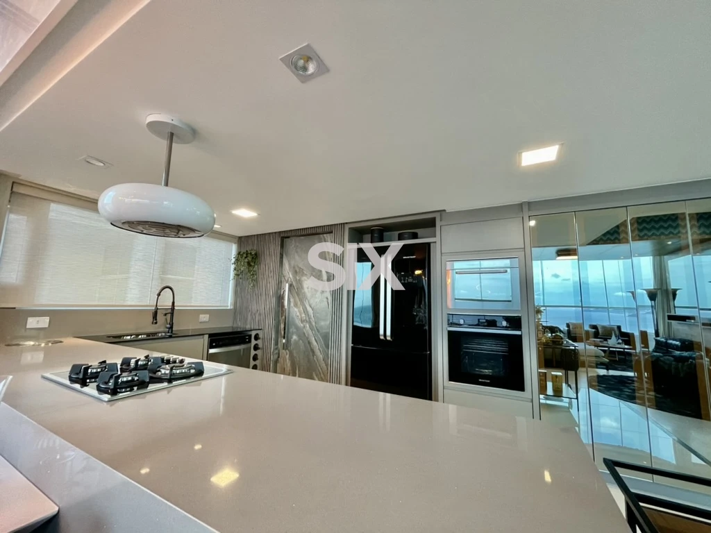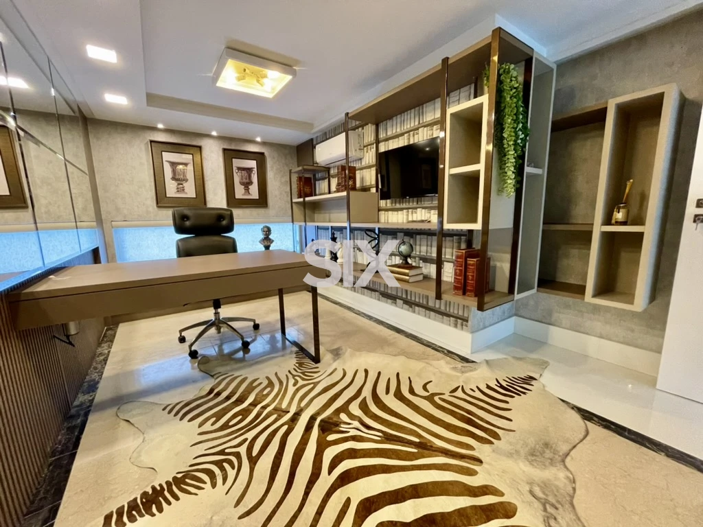 Suíte Master de 90 m² com Hidro com Cromoterapia e Sacada, área de festa com cozinha completa e churrasqueira (com paredes laterais de vidro duplos laminado e temperado), piscina embutida no chão com aquecimento solar e trocador de calor (com teto retrátil com proteção UV), varanda.