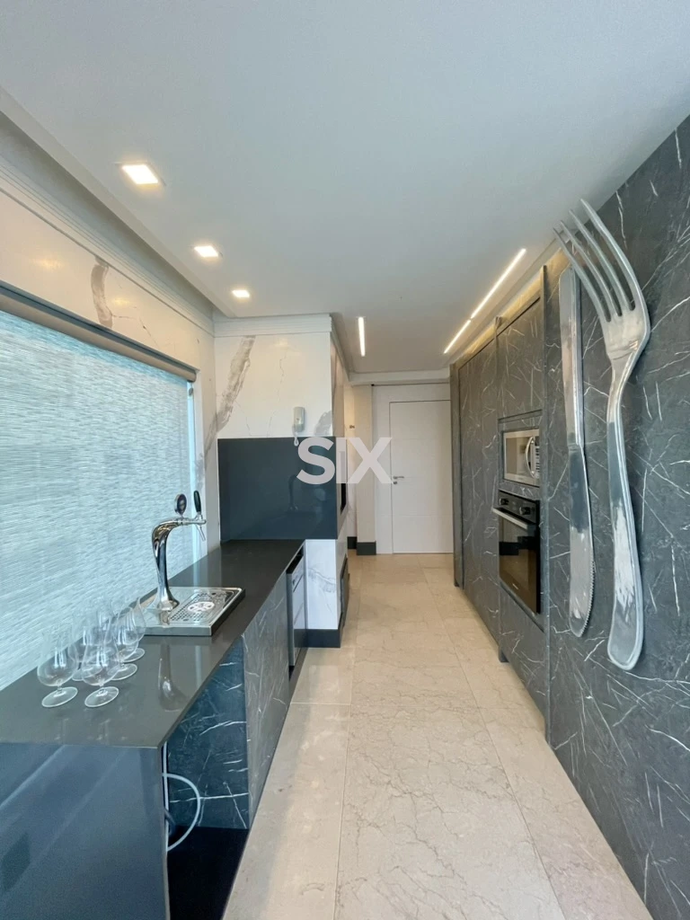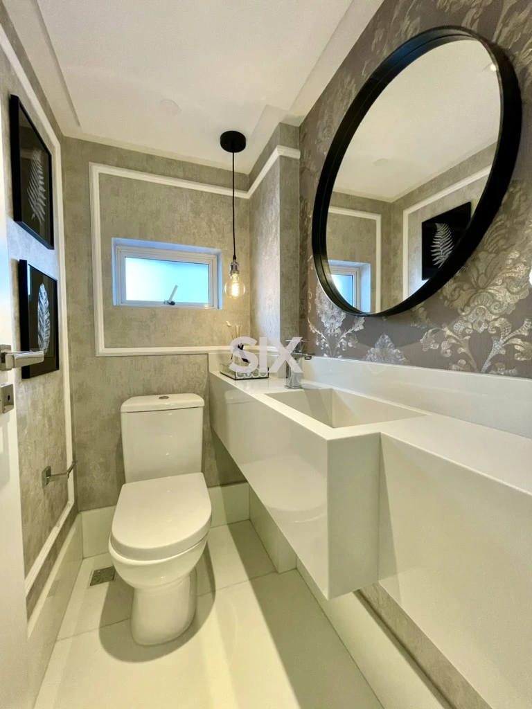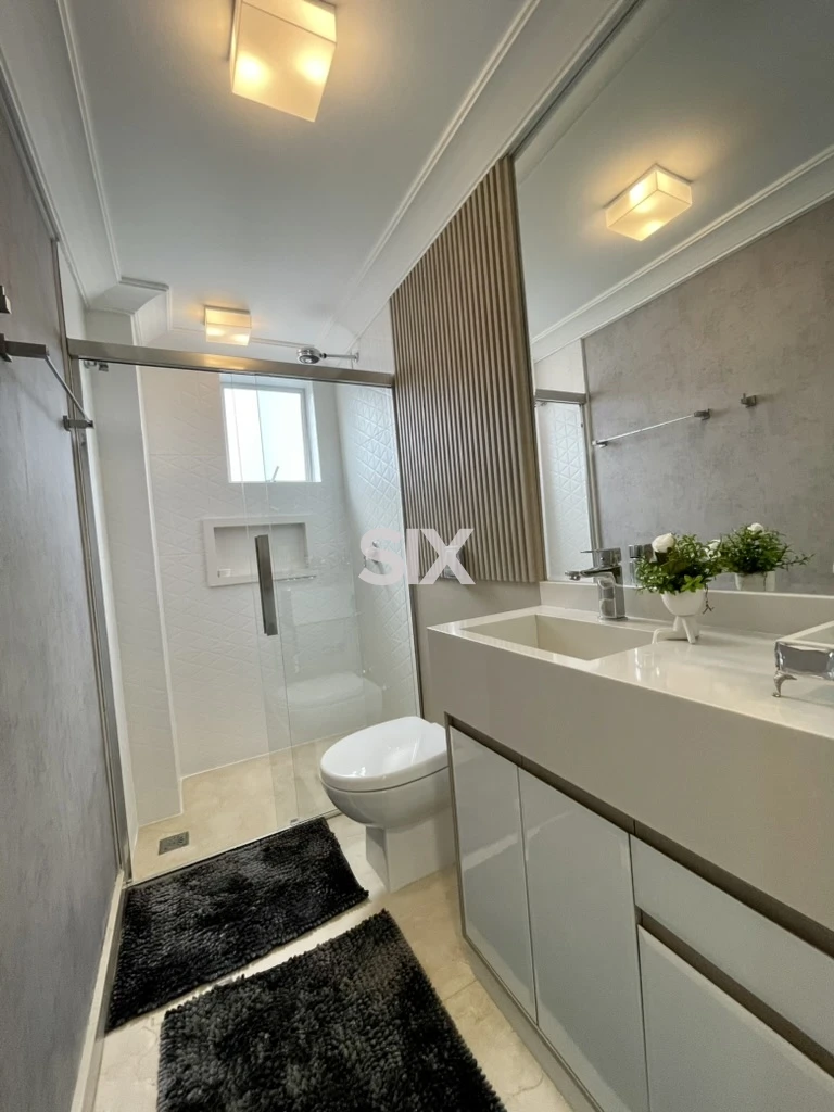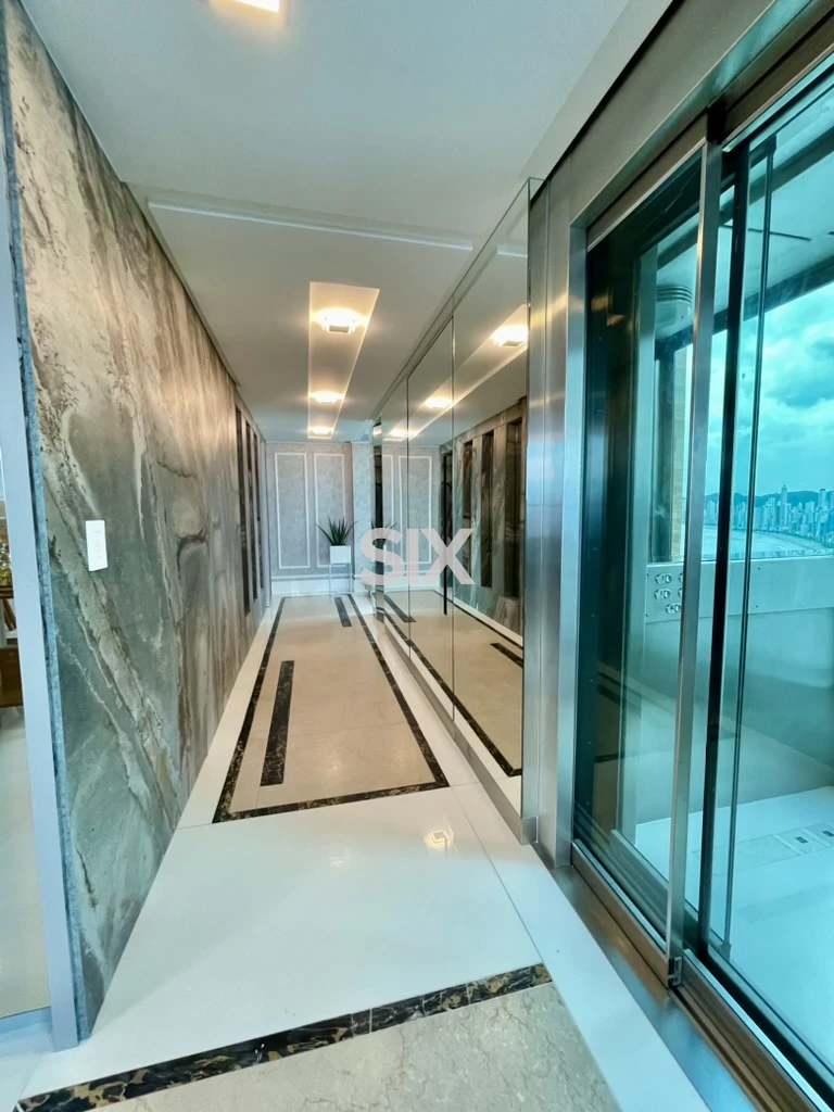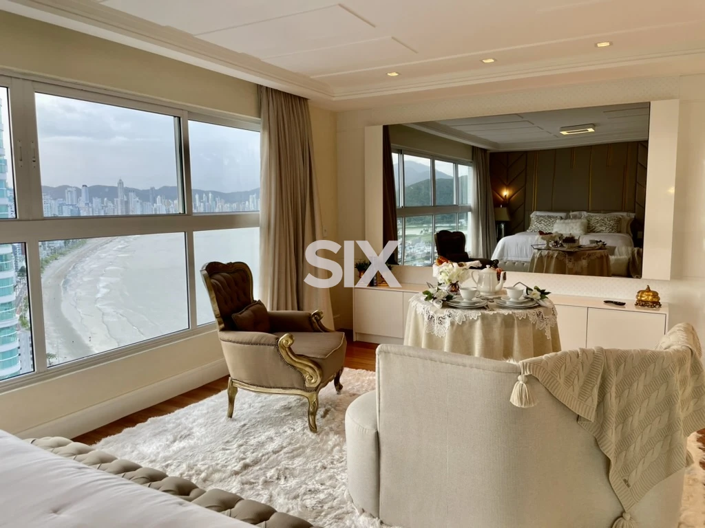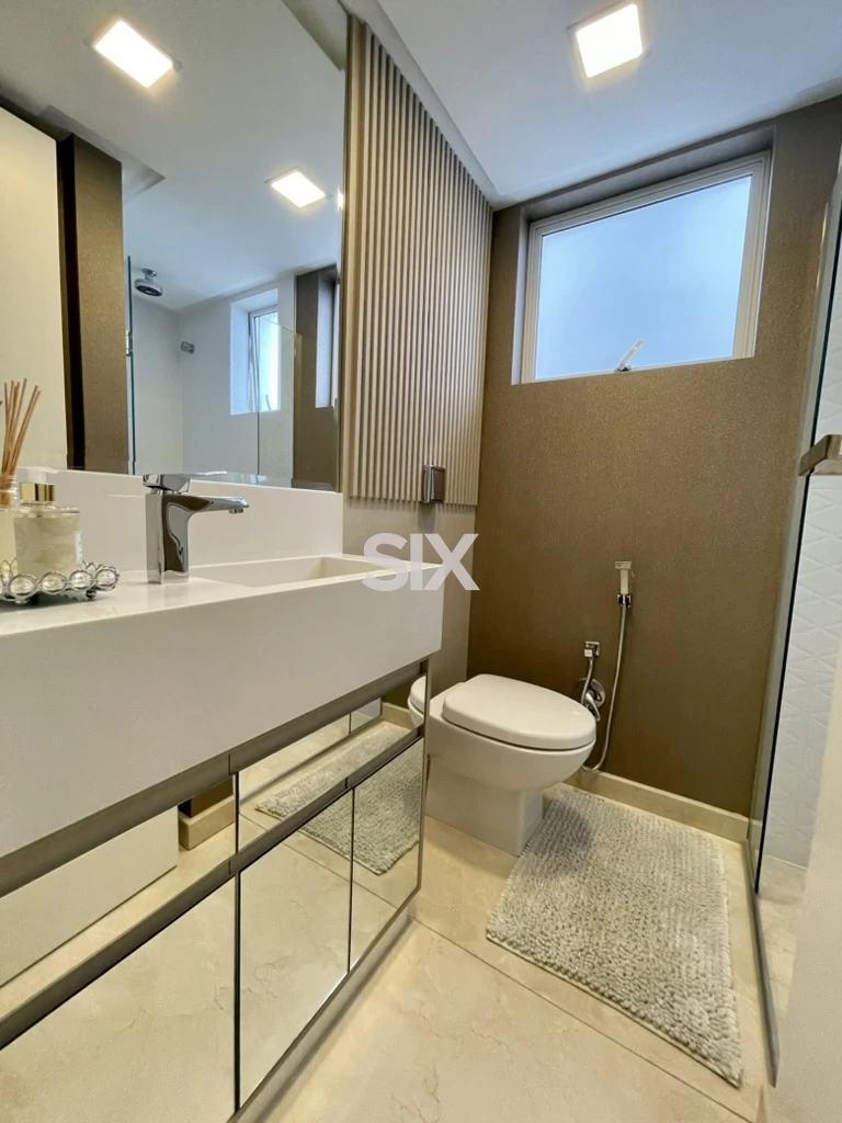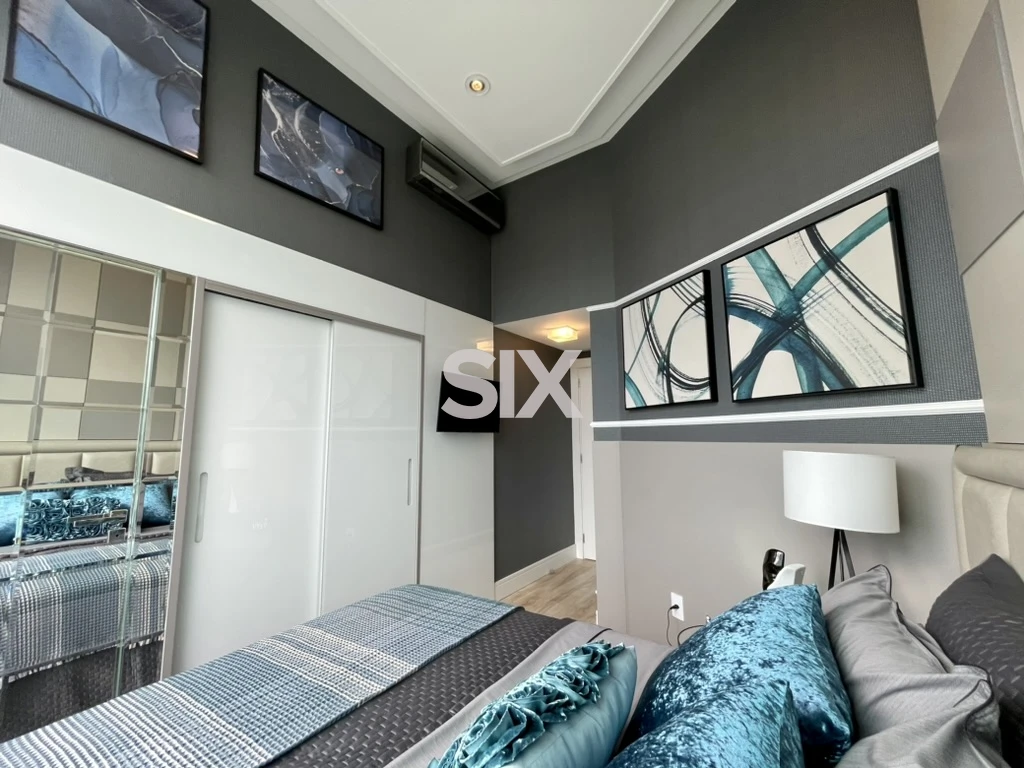 Suíte Master de 90 m² com Hidro com Cromoterapia e Sacada, área de festa com cozinha completa e churrasqueira (com paredes laterais de vidro duplos laminado e temperado), piscina embutida no chão com aquecimento solar e trocador de calor (com teto retrátil com proteção UV), varanda.