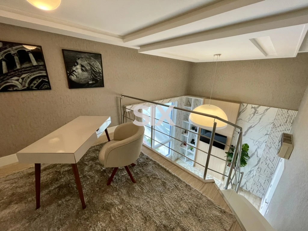 Sala (com pé direito alto), cozinha, área de serviço, 4 suítes (sendo que 1 Suíte possui sacada e pé direito alto; e 2 suítes tem mezanino), lavabo