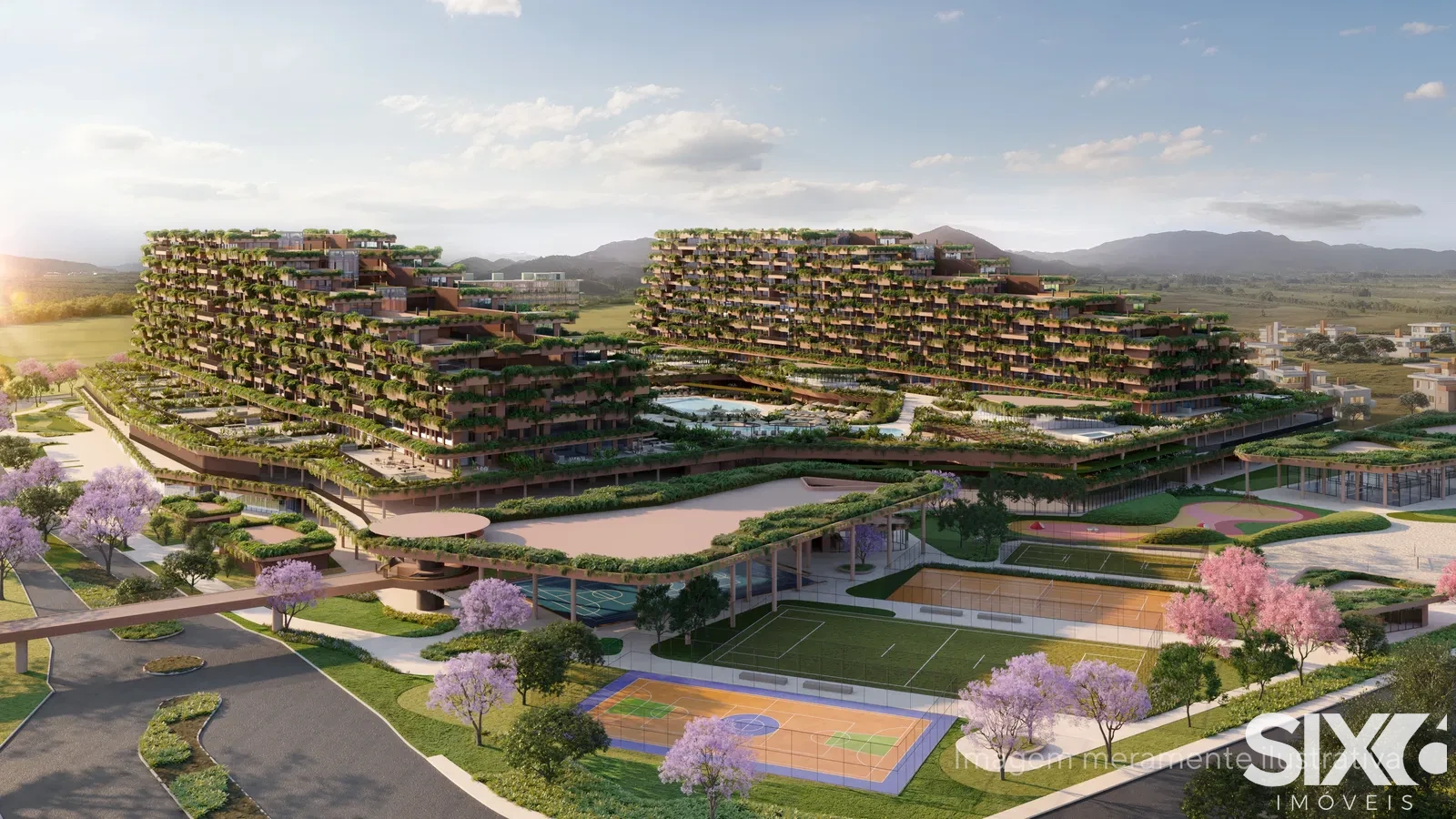 Quadras de tênis profissionais, quadra de Pickleball, quadras de beach tennis, quadras de paddle, cobertas e descobertas, quadras poliesportivas (cobertas e descobertas), campo de futebol society, campo de futebol infantil, playground completo para crianças, pista de skate, point Gourmet integrado às áreas esportivas.