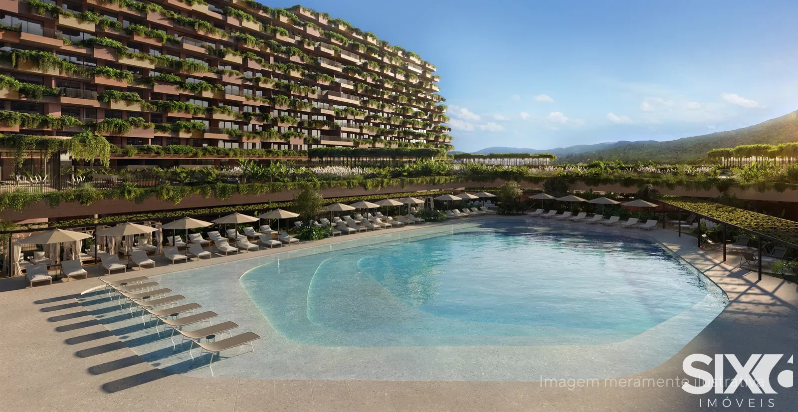 Piscina com praia de areia, trazendo a experiência de um paraíso particular, parque aquático completo, com opções para todas as idades, parque aquático térmico para utilização em todas as estações, piscina com raia semiolímpica, perfeita para treinos, point gourmet à beira d’água, Bistrô com vista para o lago.